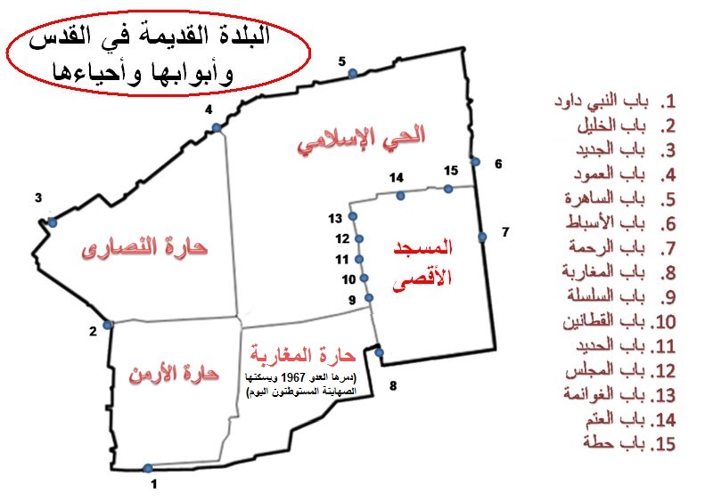 تضم البلدة القديمة أربعة أحياء أصيلة تنتمي لأبناء هذه المدينة وهي الحي الإسلامي وحي النصارى وحي الأرمن وحي المغاربة الذي كان يقطن فيه العائلات مغربية الأصل, الذين كانوا يأتون للعبادة أو التجارة في القدس أو كليهما ويستقرون فيها ولكن وللأسف إبان حرب النكسة عام 1967م, وزيادة أعداد اليهود الذين هاجروا لفلسطين بعد النكبة تم مصادرة أجزاء كبيرة من المساحة التي تشكل حارة المغاربة وهدم جزء كبير منها لإنشاء ساحة مجاورة لحائط البراق لصالح اليهود ومستوطنيهم الأوباش .